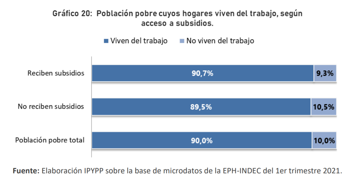 Los hogares desenvuelven distintas estrategias de manutención con el fin de garantizar la satisfacción de sus necesidades. Los datos indican la elevada incidencia que tiene el trabajo como vía de obtención de ingresos: 9 de cada 10 personas residen en hogares cuyos ingresos provienen parcial o totalmente del trabajo. Este valor es incluso algo mayor entre la población pobre, por lo cual no quedan dudas que si hay algo que no es necesario es promover “la cultura del trabajo”. A su vez, una cuarta parte de la población vive en hogares que reciben subsidios como la Asignación Universal por Hijo o la Tarjeta Alimentar, entre otros. Entre los hogares que perciben subsidios monetarios, en promedio estos sólo representan el 15% del ingreso total familiar, mientras que los ingresos laborales explican cerca del 70% del ingreso total. A ello se adiciona que un 11,4% de la población total recurre a mercaderías, ropa o alimentos provistos por instituciones (Gobierno, Iglesias, etc.). Por otra parte, más de un tercio de los personas (36,6%) debieron utilizar sus ahorros familiares afectando su patrimonio. Los hogares también recurren a endeudarse, trasladando sus erogaciones a futuro: casi una quinta parte pidió préstamos a familiares o amigos, uno de cada diez utilizó créditos de bancos o financieras, mientras que las compras en cuotas con tarjeta fueron utilizadas por más de la mitad de la población.