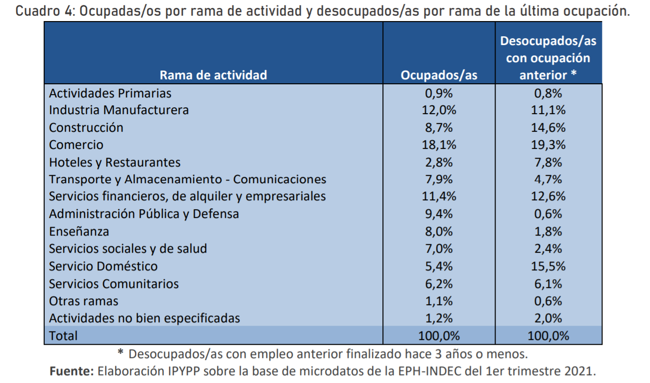Y por último, la tabla que sigue ilustra la rama de actividad y su distribución entre ocupados/as y desocupados/das, siendo una información muy útil para pensar el impacto de la pandemia en las condiciones de vida del electorado.